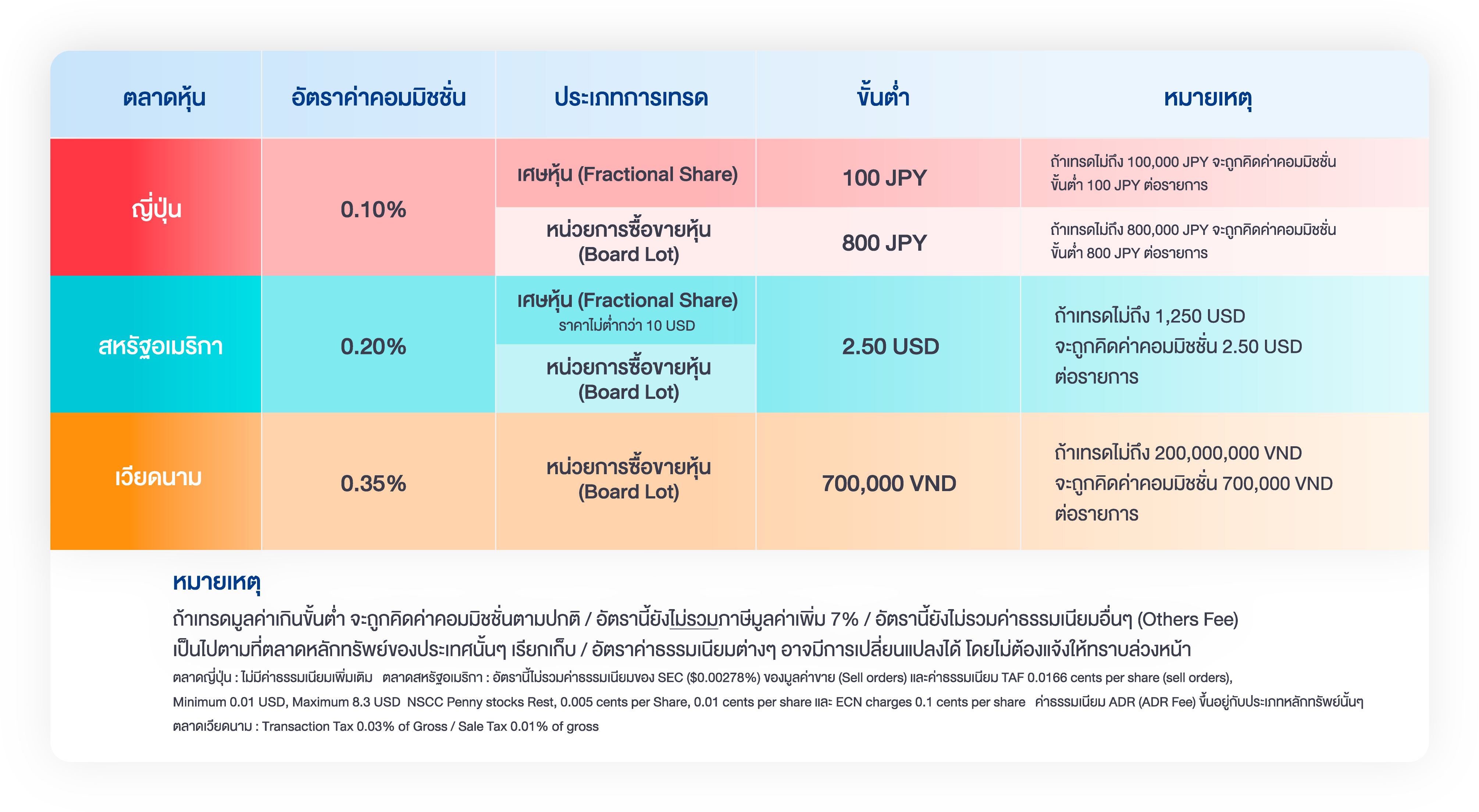 | ตลาด (Market) | อัตราค่าธรรมเนียมแล้วแต่จำนวนใดสูงกว่า ระหว่าง (1) และ (2) | |
